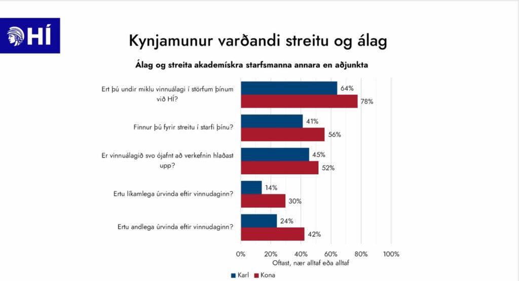 Kvenkyns starfsfólk Háskóla íslands finnur fyrir meiri streitu í starfi en karlkyns kollegar þeirra. Þetta kemur fram í nýrri starfsumhverfiskönnun Félagsvísindastofnunar sem var kynnt á upplýsingafundi rektors miðvikudaginn 8. október.