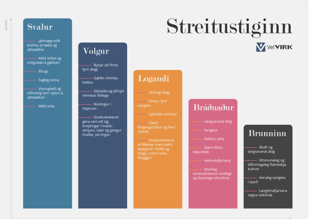 Einnig var tekinn upp svokallaður streitu stigi sem er til þess gerður að starfsmenn geti staðsett sig á honum og gefið stjórnendum vísbendingar um hvar er mikill hætta á kulnun. 24% starfsfólks Háskóla Íslands sögðust vera logandi, bráðnuð eða brunninn sem eru 3 efstu stigin. Inn á síðunni vel virk.is má finna upplýsingar um hvert og eitt stig streitustigans.